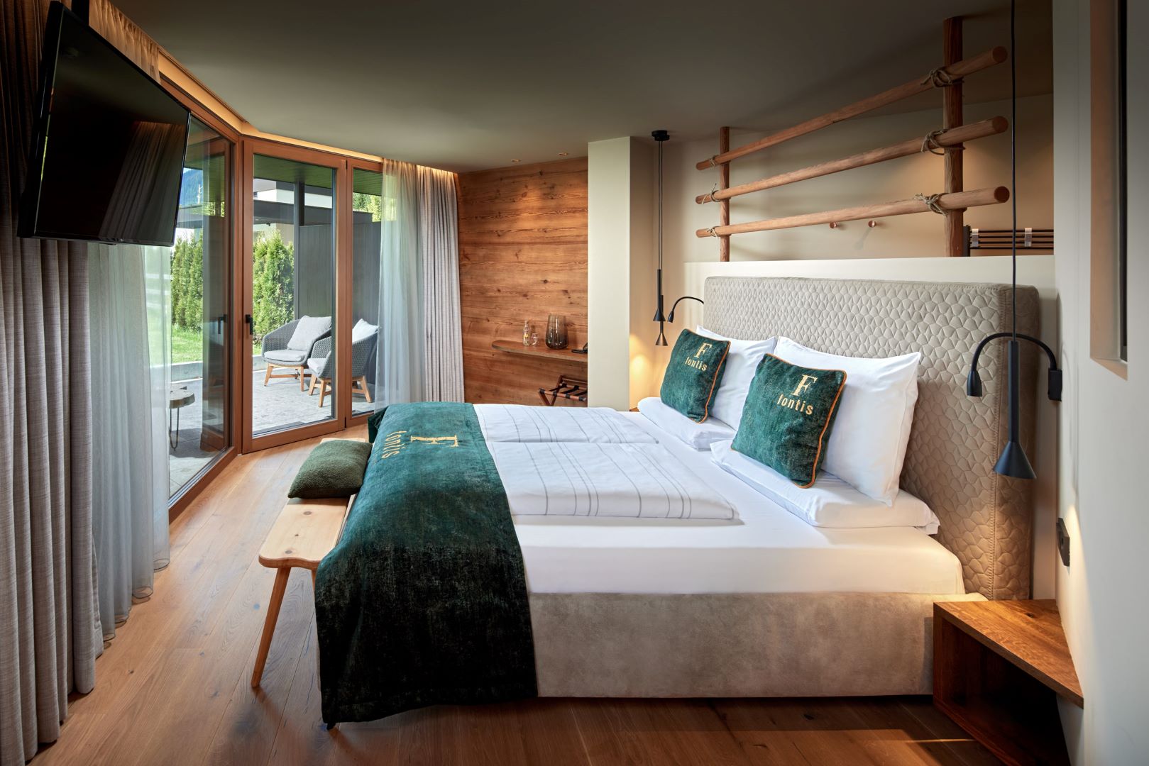 Fontis bietet verschiedene Suitenkategorien wie Green Suite, Nature Suite und Loft Suite. Ausgestattet mit hochwertigen Materialien und Blick auf die Dolomiten. Jede Suite verfügt über eine privat Lounge und Zugang zum organischen Badeweiher (Organic Bathing Pond) im Rahmen des Green SPA.