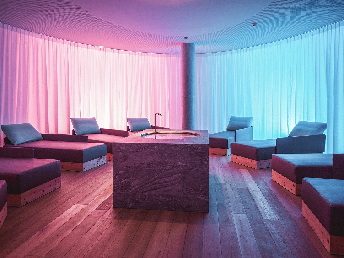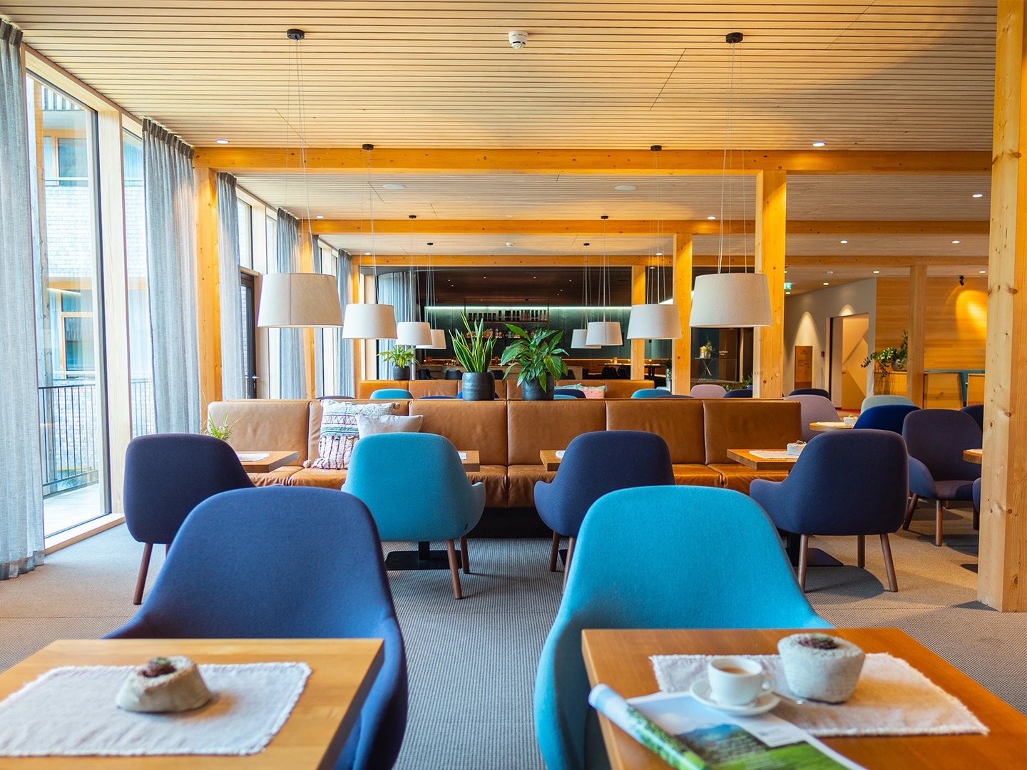 Die Bade-Wellness-Welt ist großzügig verglast und auf Aussicht hin gebaut. Sie umfasst ganzjährig beheizte Innenpools, einen ebenfalls ganzjährig beheizten Gartenpool mit Blick auf die umliegenden Wiesen und die Kanisfluh sowie einen Whirlpool. Ein abgetrennter Kinder-Spaßpool mit Pilzbrunnen und Wasserspielbereich schafft Raum für Familien, während Ruhezonen und Liegewiese (im Sommer mit Sonnenliegen und Sonnenschirmen) stille Rückzugspunkte anbieten. Im Winter ist Baden im Außenpool auch bei Schneefall möglich.