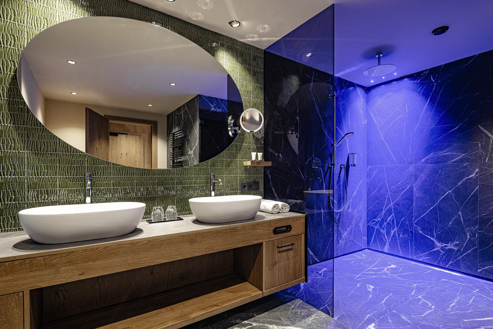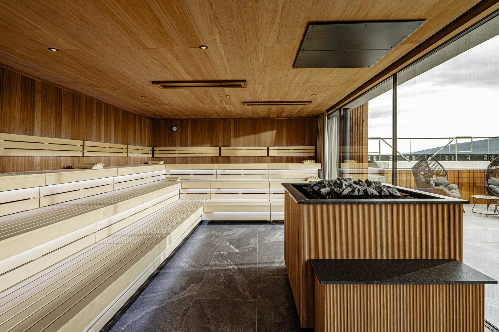 Der beheizte Infinity-Skypool schafft eine visuelle Verbindung von Himmel, Wasser und Bergpanorama. Das Sky Spa (Adults-only) setzt auf Saunen mit Panoramablick und Duftinszenierungen; die Aufgussformate reichen von „Freier Atem“ bis „Rock ’n’ Sweat“ oder „Die Kraft der Natur“.